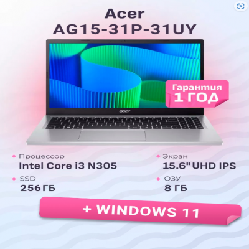 وصف Qisqacha كمبيوتر محمول Acer/AG15-31P-31UY/Aspire Go 15/1g/Core i3/N305/1.8 GHz/8 Gb/PCIe NVMe SSD/256 Gb/بدون ODD/الرسم UHD/256 Mb/15.6/1901x