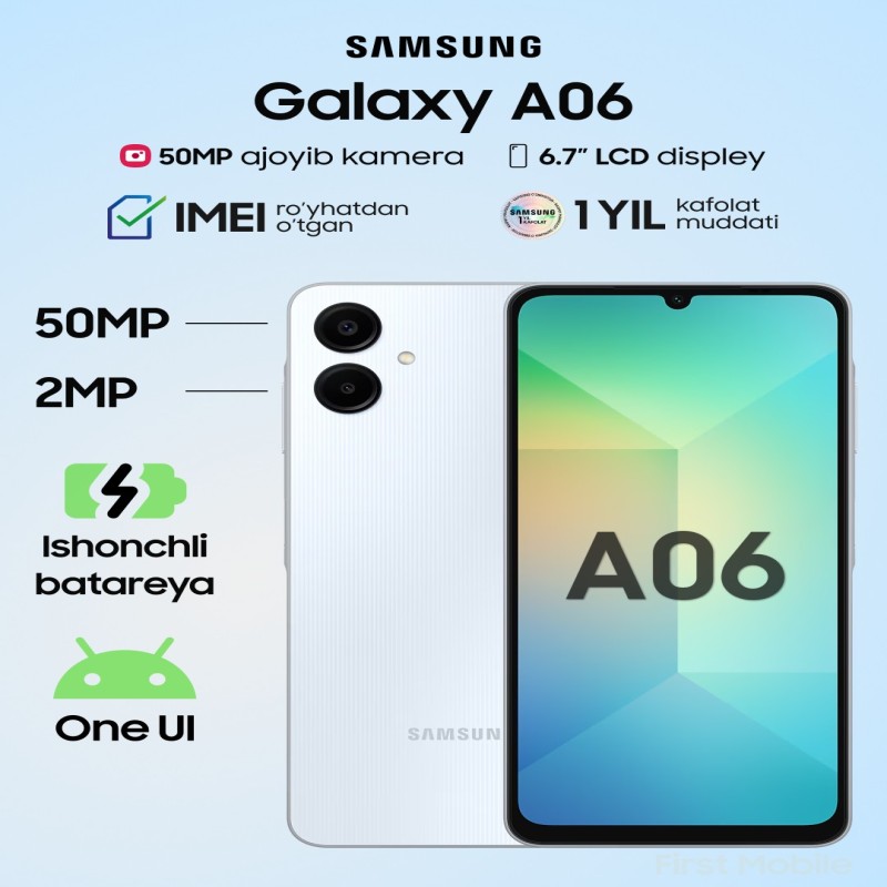 Galaxy A06 يورقان تاجروتيكىڭىزنى 6.7 اينچلىق چوڭ ءىسكەنسايدى ىشكەرلەيدى. 60 Gts ساپ دەرەۋ روتاتسىياسى جانە TFT U-Cut ءىسكەنسايى بەتتەرىنە قاتا تولىق جەدەلدىكىنە ءسالىپ، تاجروتىڭىزدى تىكەنەيتىپ تۇسەر. جاڭارتۋدى قۇتتىقتاڭىز.