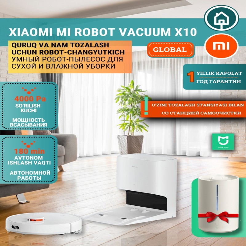 إذا اشتريت روبوت المكنسة الكهربائية Xiaomi X10 أو X10+ من متجر Aqlli Uy، فستحصل كمكافأة على مزيل تلوث الهواء Xiaomi Smart Humidifier 2. إنه يحافظ على الرطوبة المثالية، يمنع الجفاف، ويخلق بيئة مريحة وصحية في منزلك.